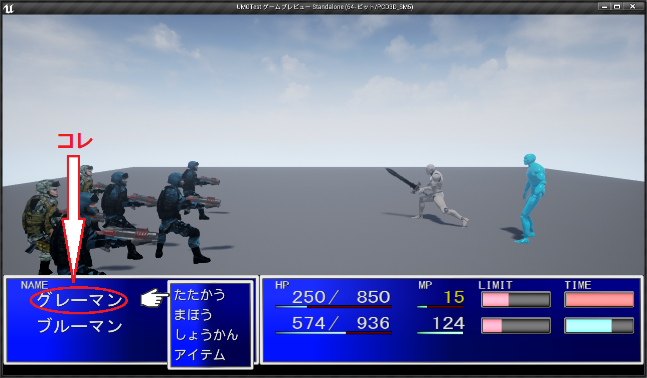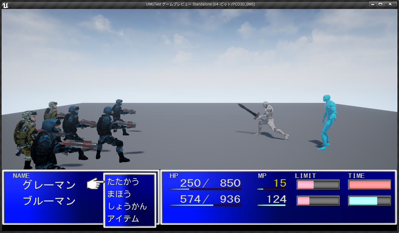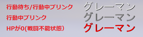 名前も同様に状態によってテキストの色が変わる動作となり、プレイヤに行動が回ってくると1番目(白色)と2番目(灰色)のブリンク表示となります。