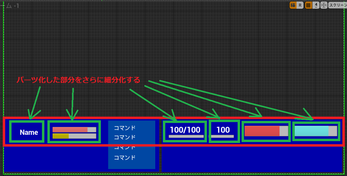 ②でパーツ化した箇所を、緑枠のようにさらに細分化します(構想だけ)。