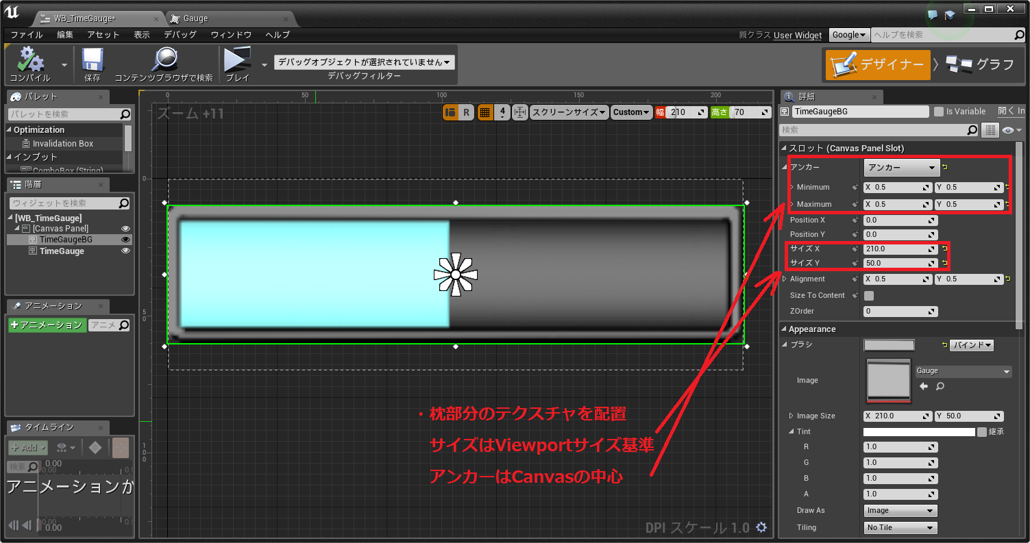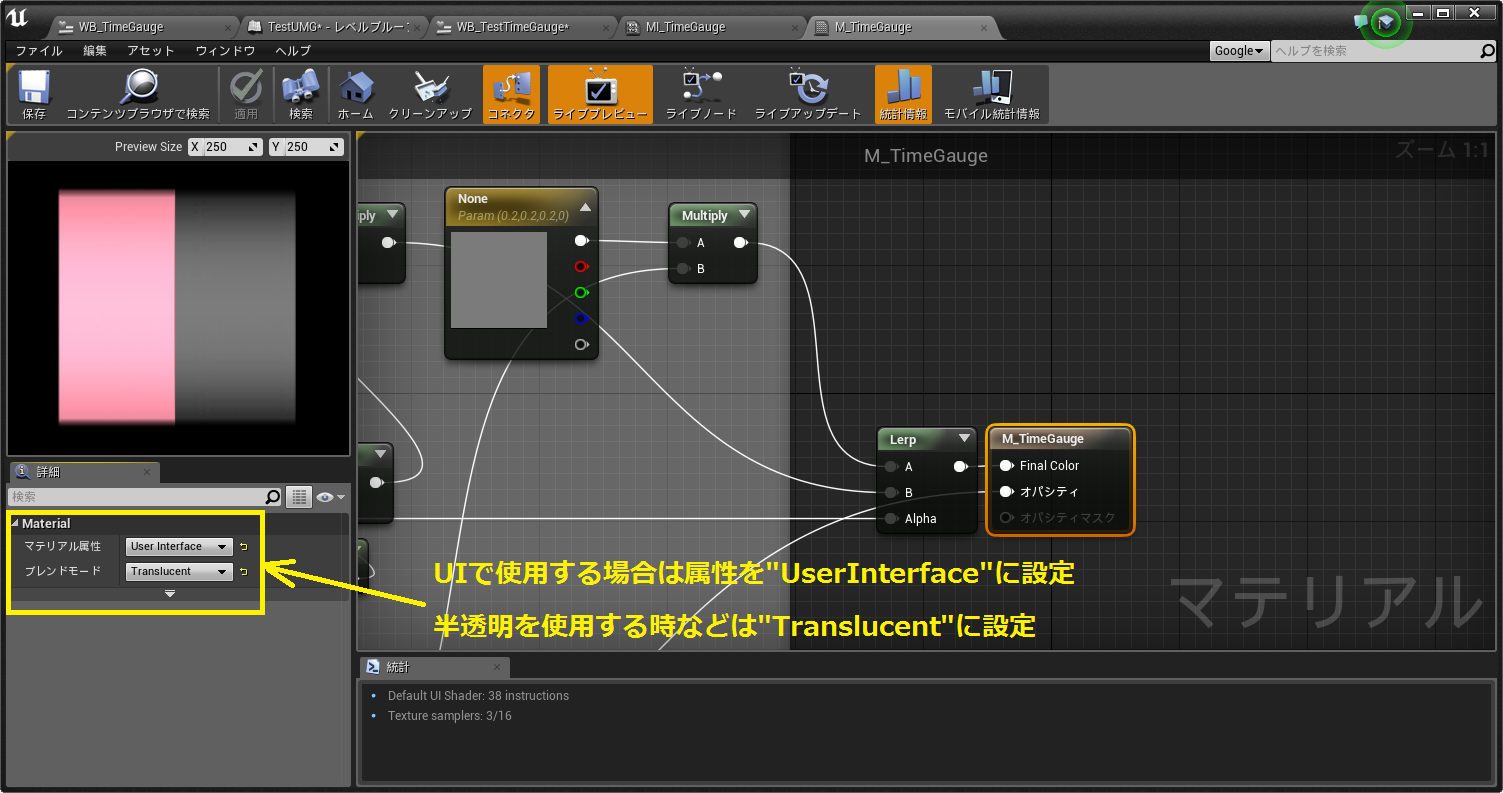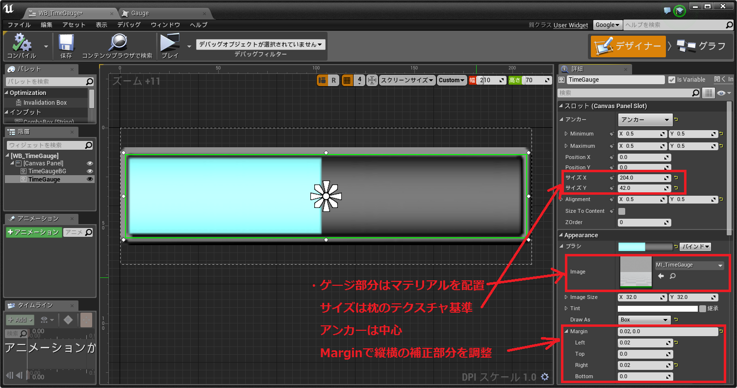 ゲージ部分のマテリアルは上記のように(ContentExampleのサンプルを流用)作成し、