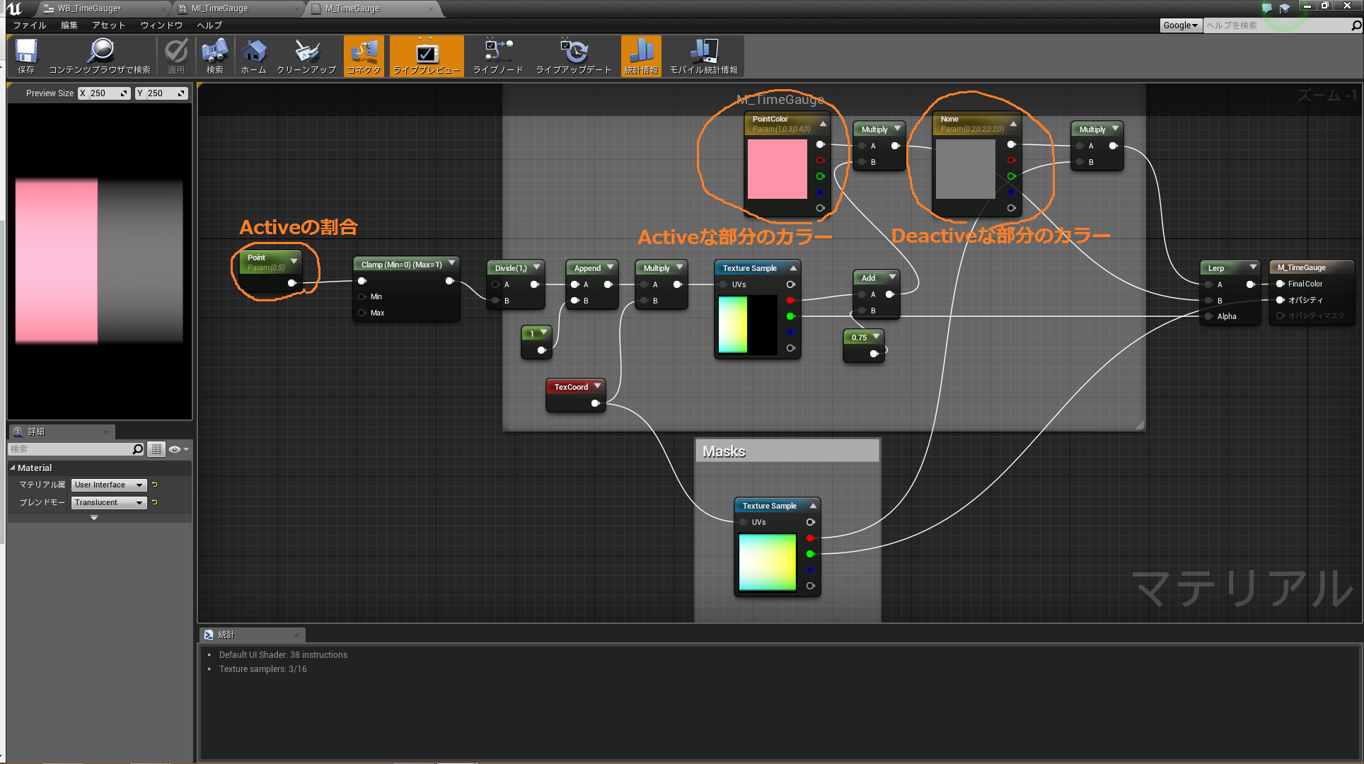 ゲージの割合をScalarParameter、ゲージのActive/Deactiveな部分のカラーをVectorParameterで外部から指定できるようにしています。