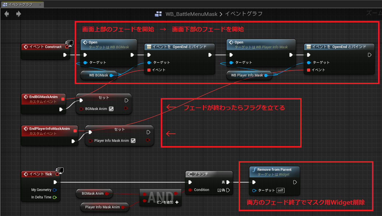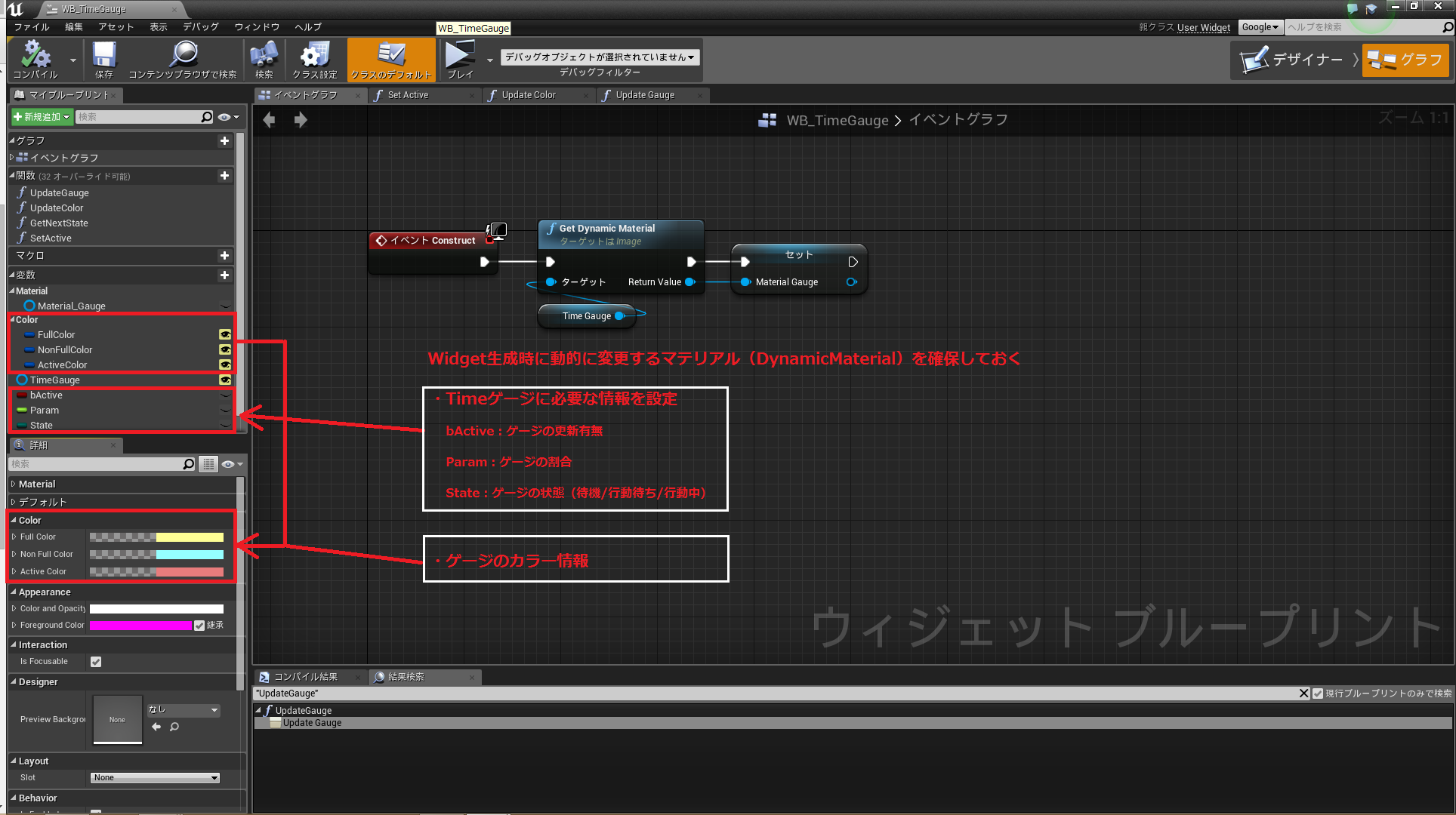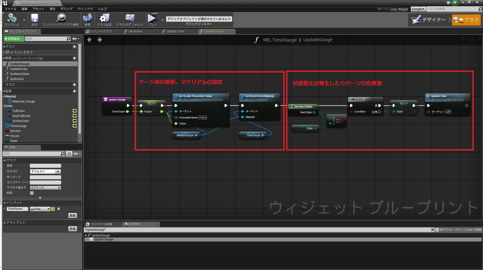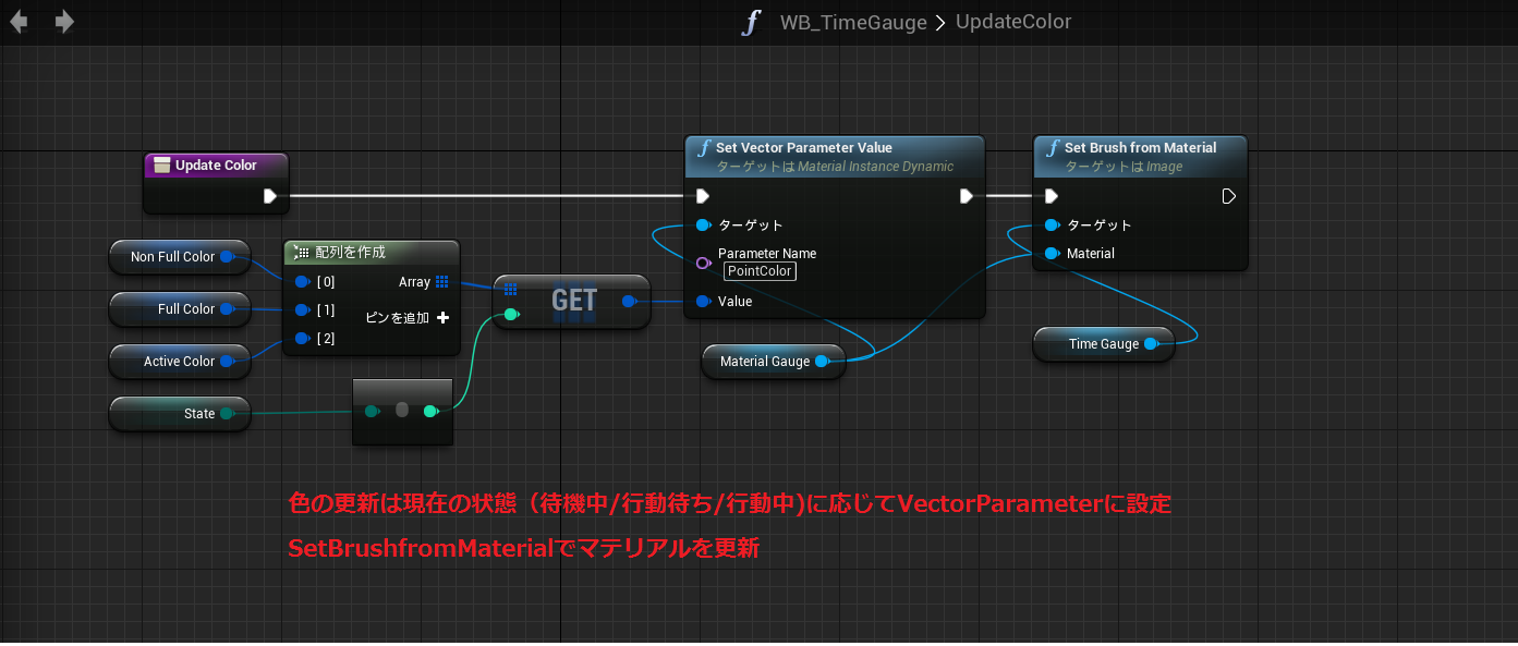 ゲージ割合を更新したタイミングでマテリアルをWidgetに反映し、さらにステートが変化したら色を更新する流れとなっています。
