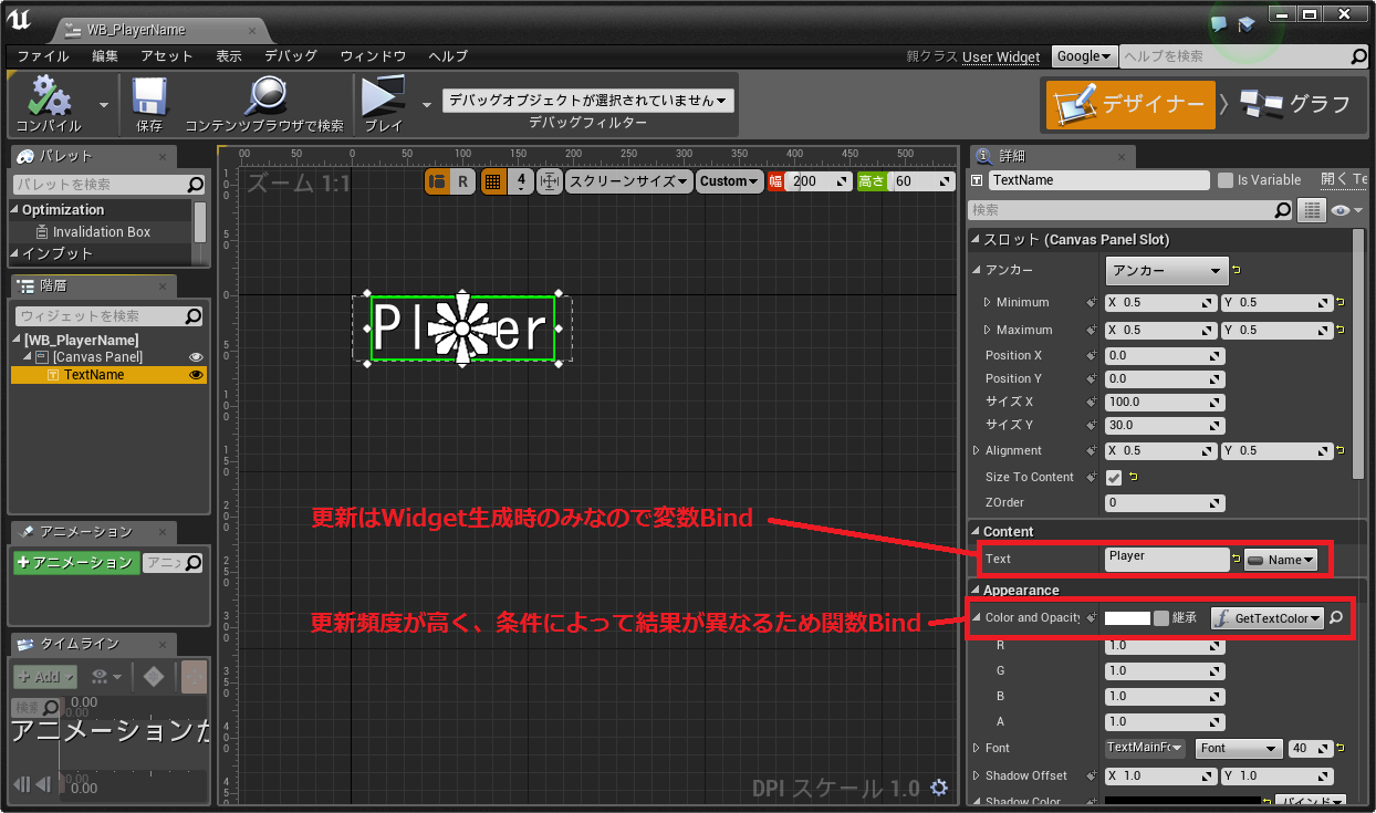 上記の動作から、名前テキスト用Widgetで変更が必要なのは「テキスト内容」と「テキストColor」となります。これらはBind機能を使用して更新します。