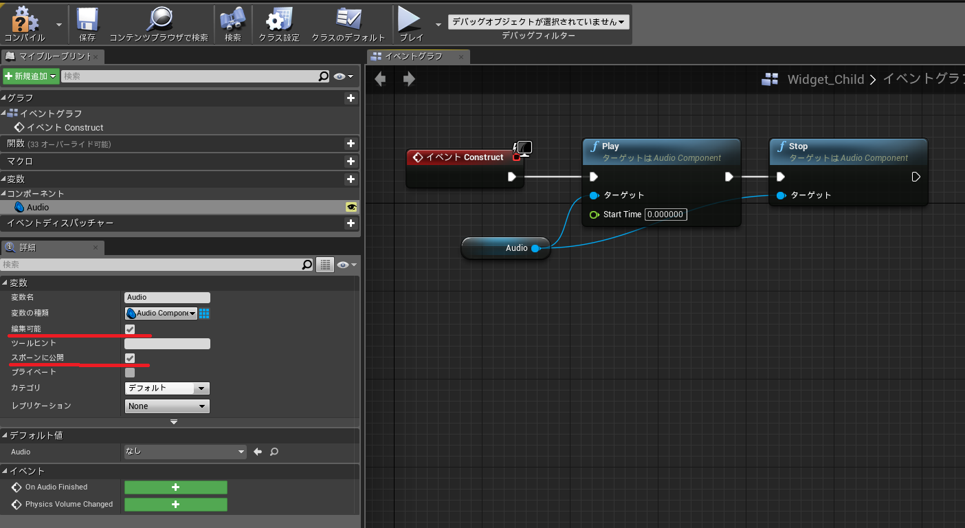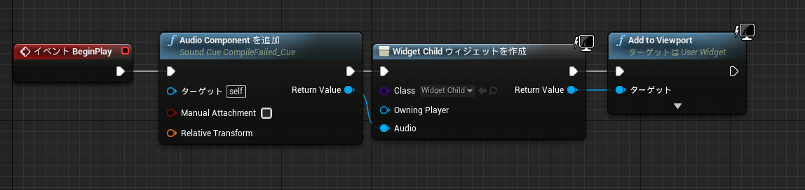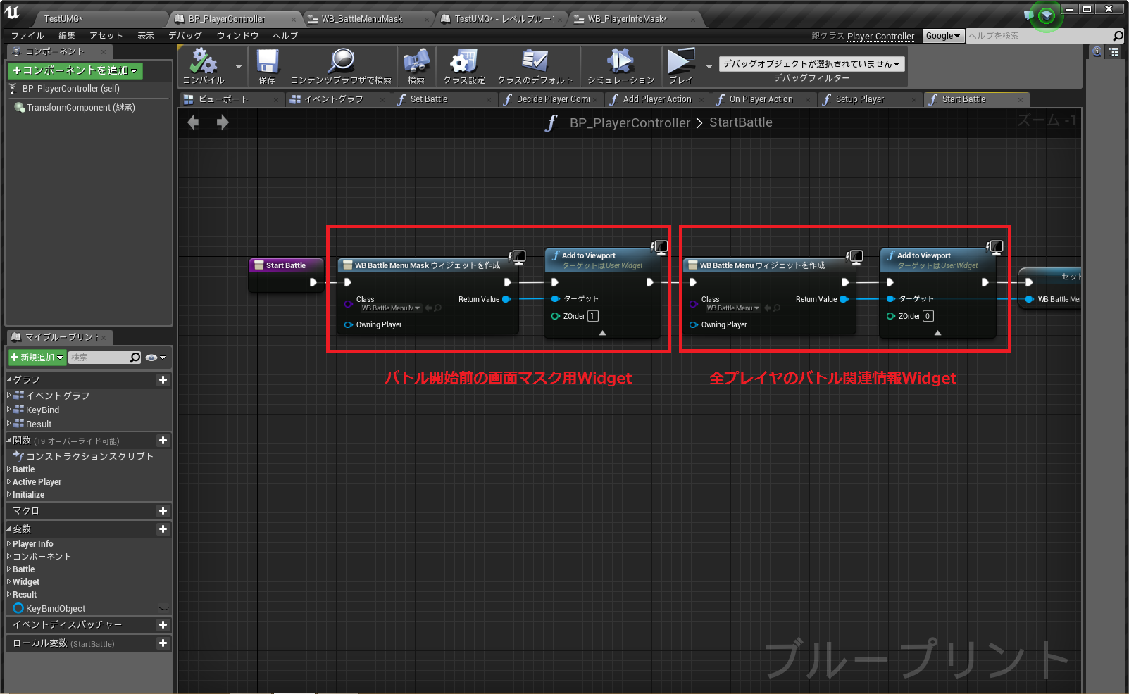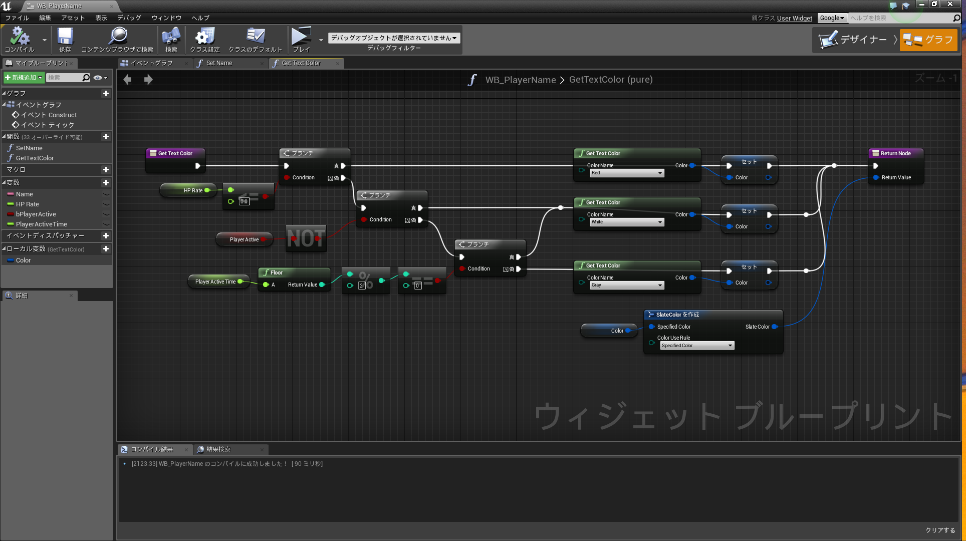 今回のケースでは変数Bindと関数Bindで分けて使用していますが、変数BindはWidget内に同型の変数が存在すればアクセスできます(候補として出てくる)。本ケースでは変数"Text"に"グレーマン"とSetすることでテキスト内容に反映することができます。