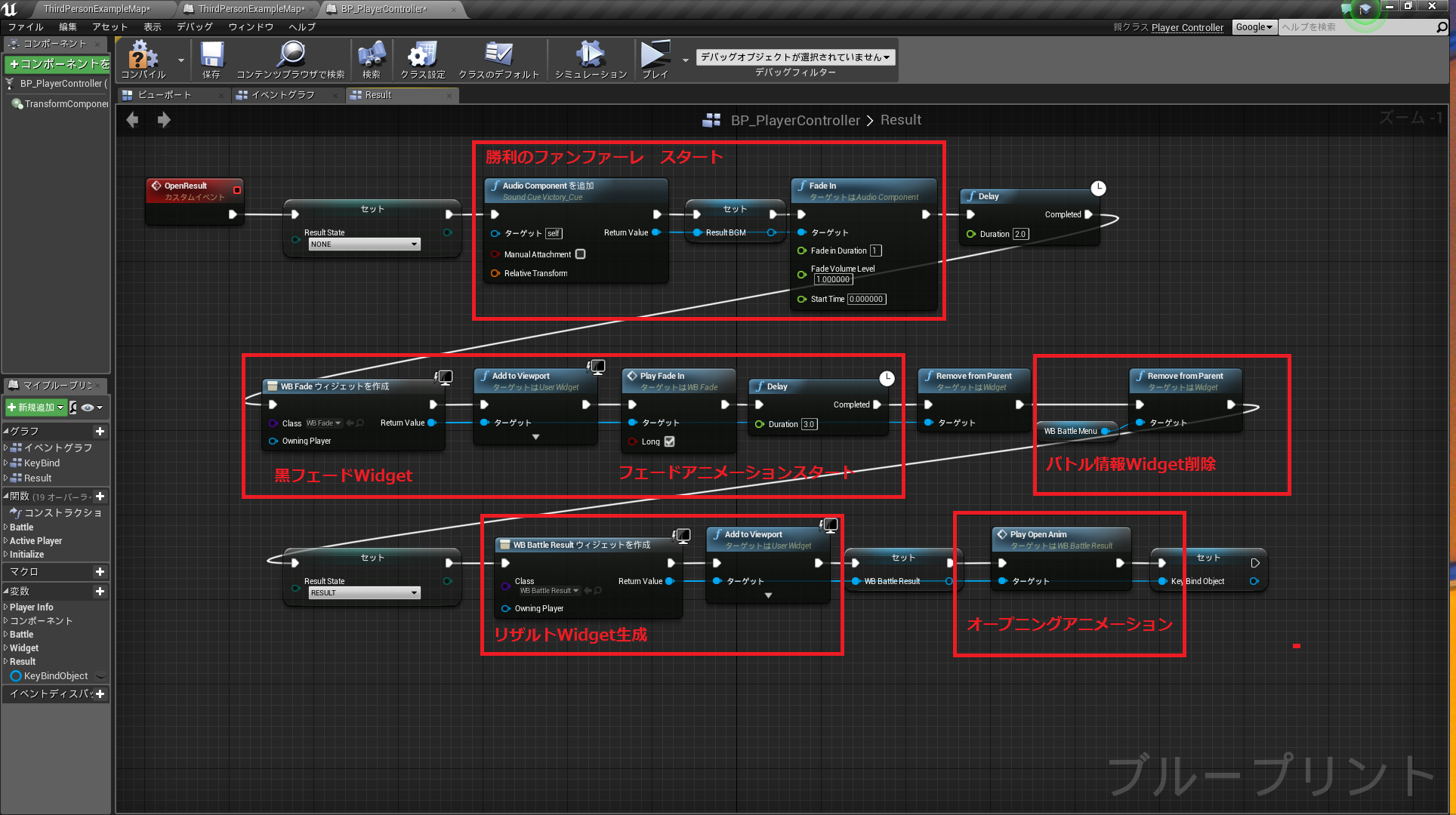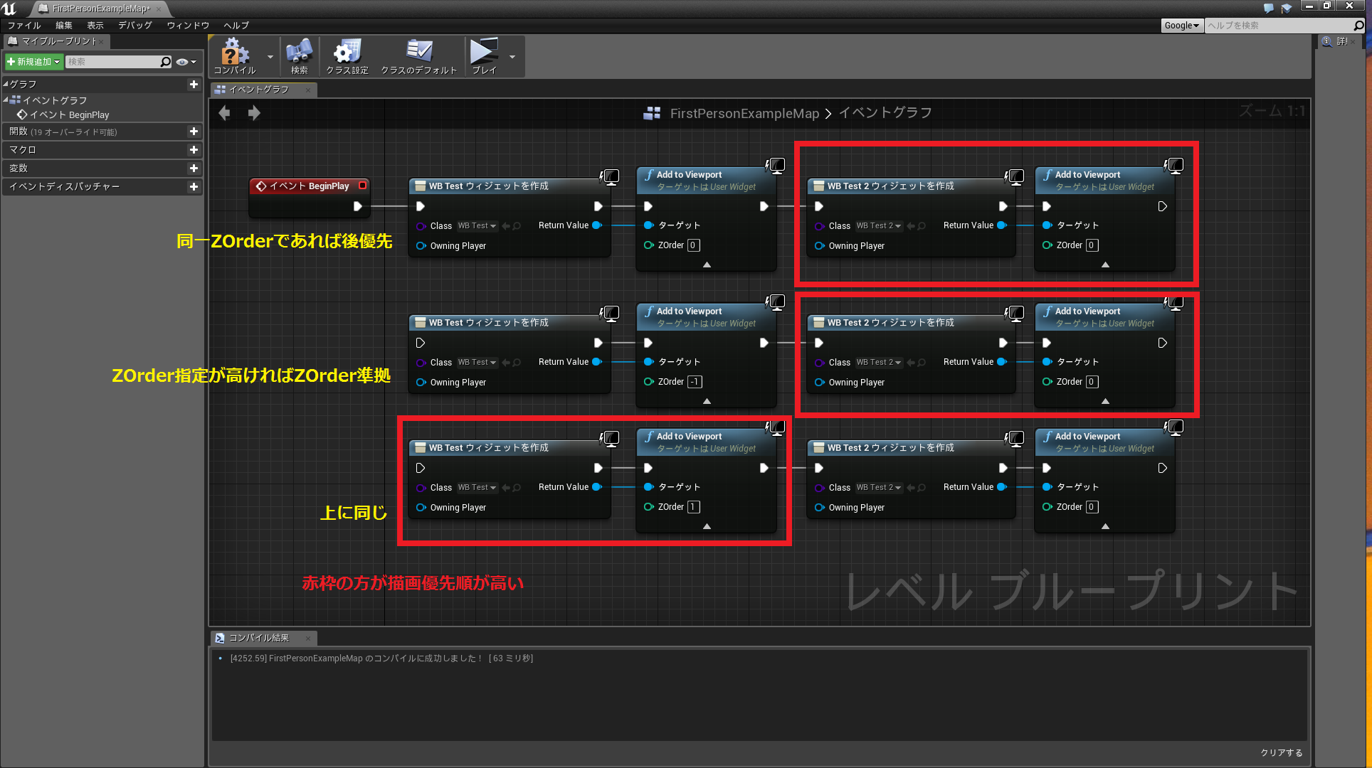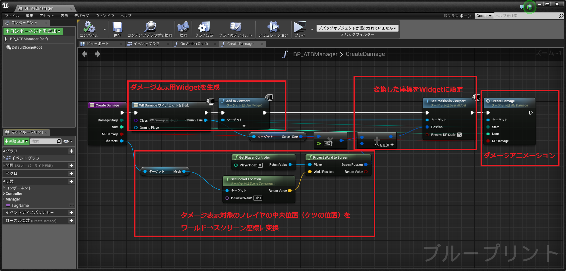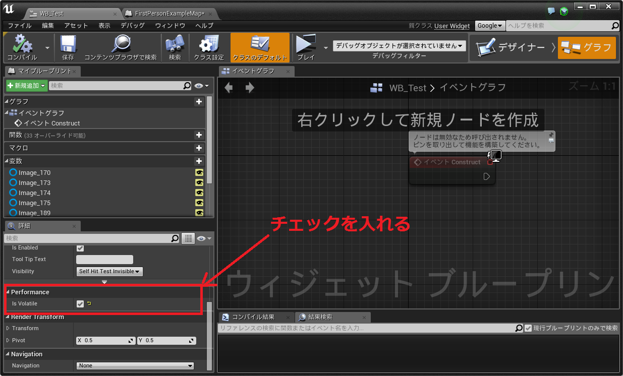 今回のケースでは変数Bindと関数Bindで分けて使用していますが、変数BindはWidget内に同型の変数が存在すればアクセスできます(候補として出てくる)。本ケースでは変数"Text"に"グレーマン"とSetすることでテキスト内容に反映することができます。