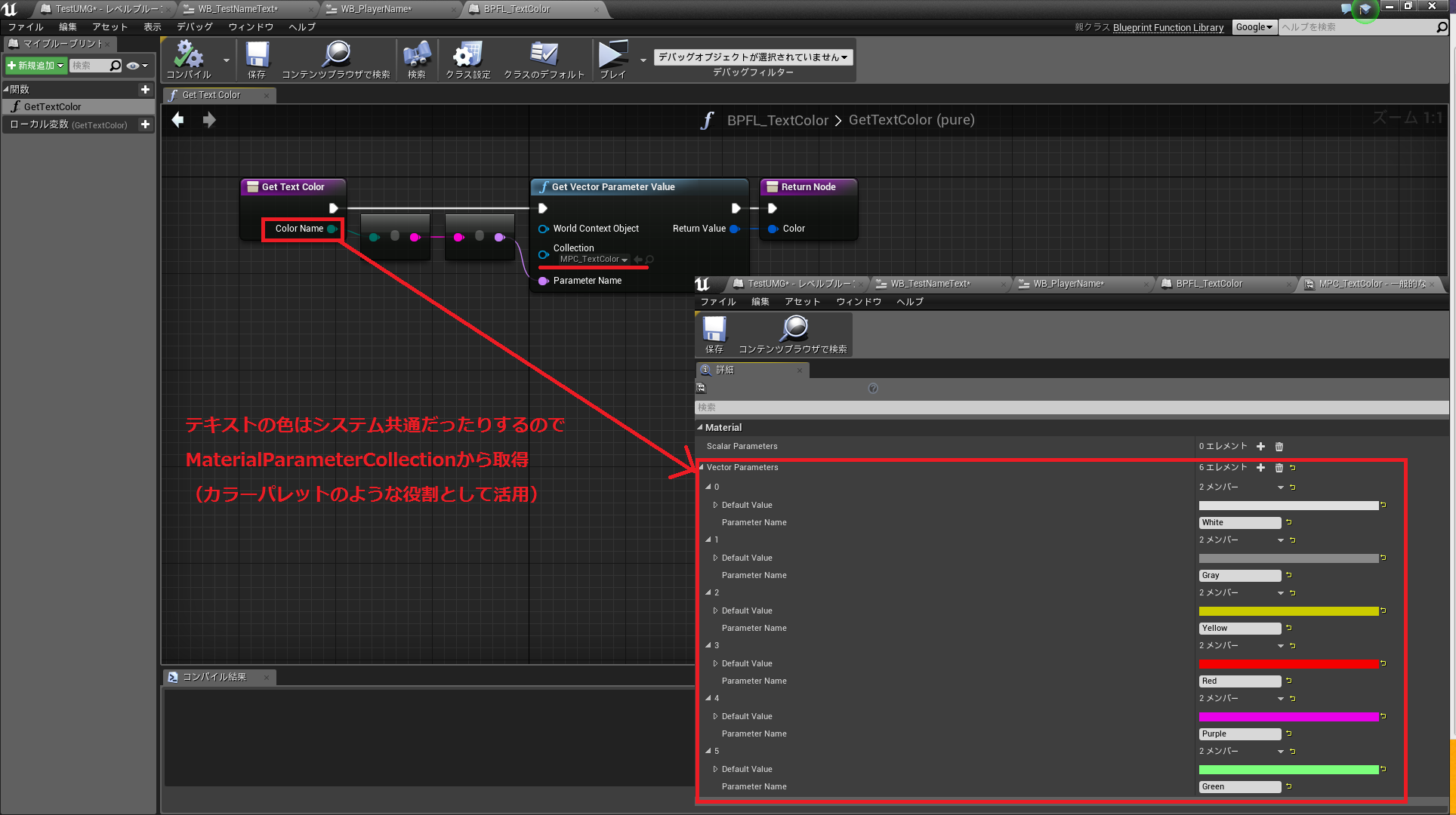 はじめにfloat型変数"HP Rate"で残HPの割合をチェックしており、残HPが0の場合はColor:Red、被Active状態ではColor:White、Active状態ではタイマとして用意している変数の値に応じてColor:White、Color:Grayを設定しています。ここでColor情報はPure関数から取得していますが、テキストのカラーはシステム共通だったりすることを考慮して(他のテキストでColor情報を設定する際にそれぞれでRGBを指定するのが面倒なので共通化してしまいました...)BlueprintFunctionLibrary経由でMaterialParameterCollectionから取得しています。