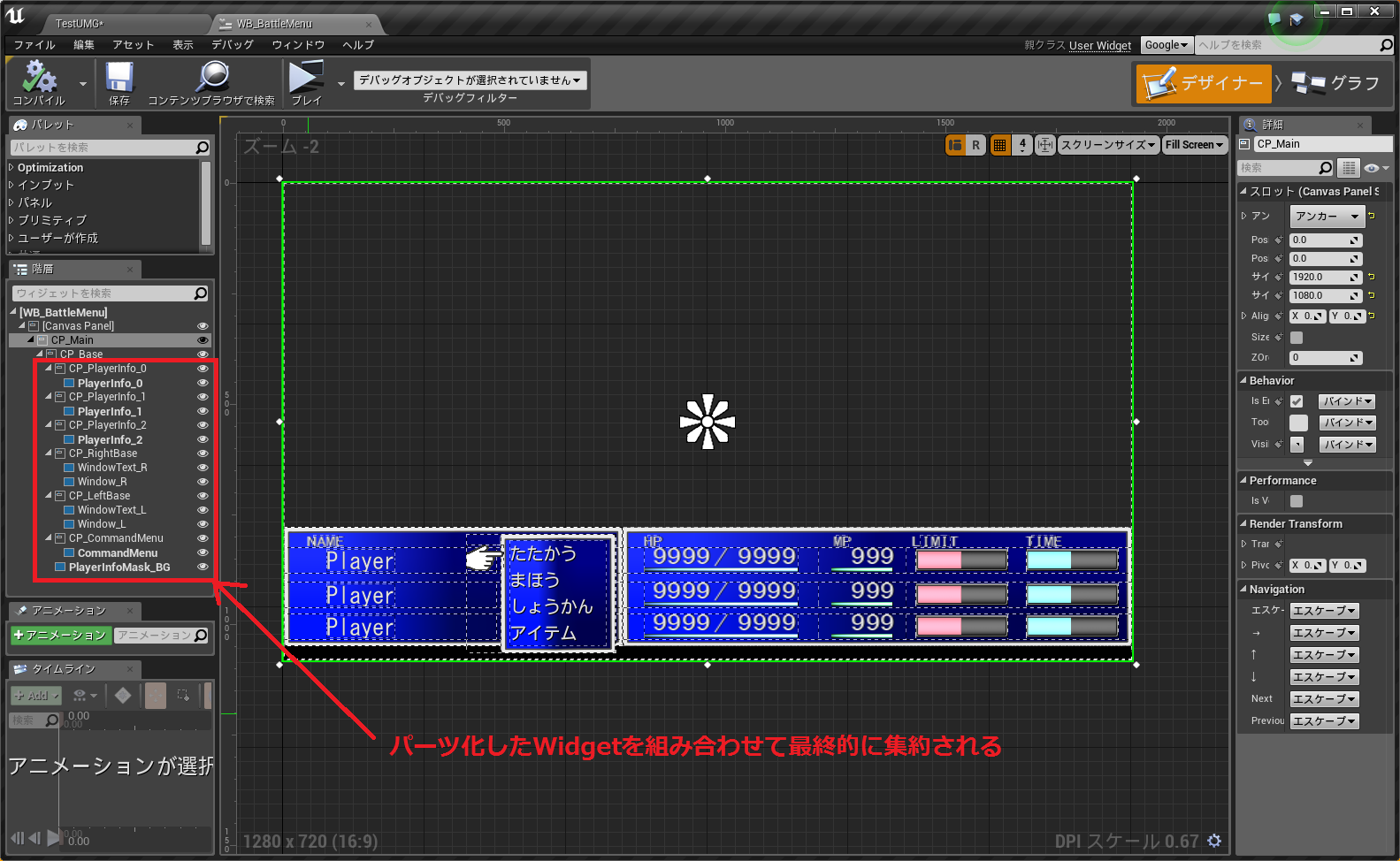 例えばHPのテキストやリミットゲージなどは、バトルメニュー以外にもフィールドメニュー等で使い回すので、ここでは細分化の対象としておきます。
