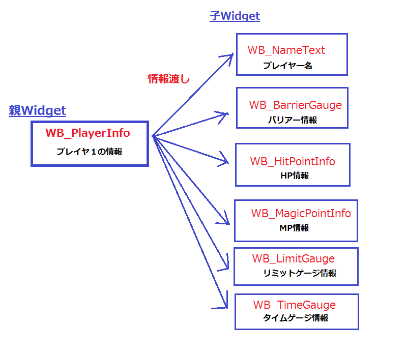 以下のように1人のプレイヤーの情報として纏めてしまい、子Widget側では自分の機能だけを果たすようにしてしまいます。