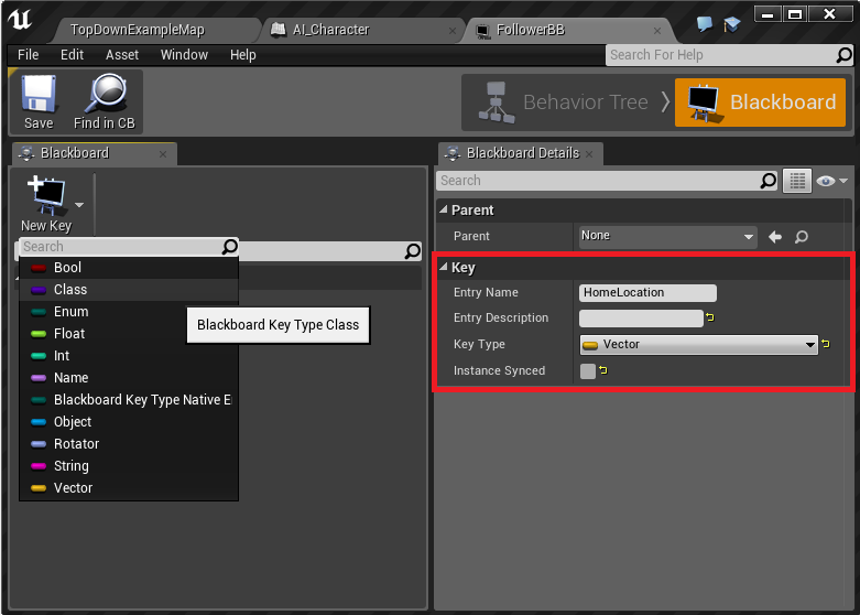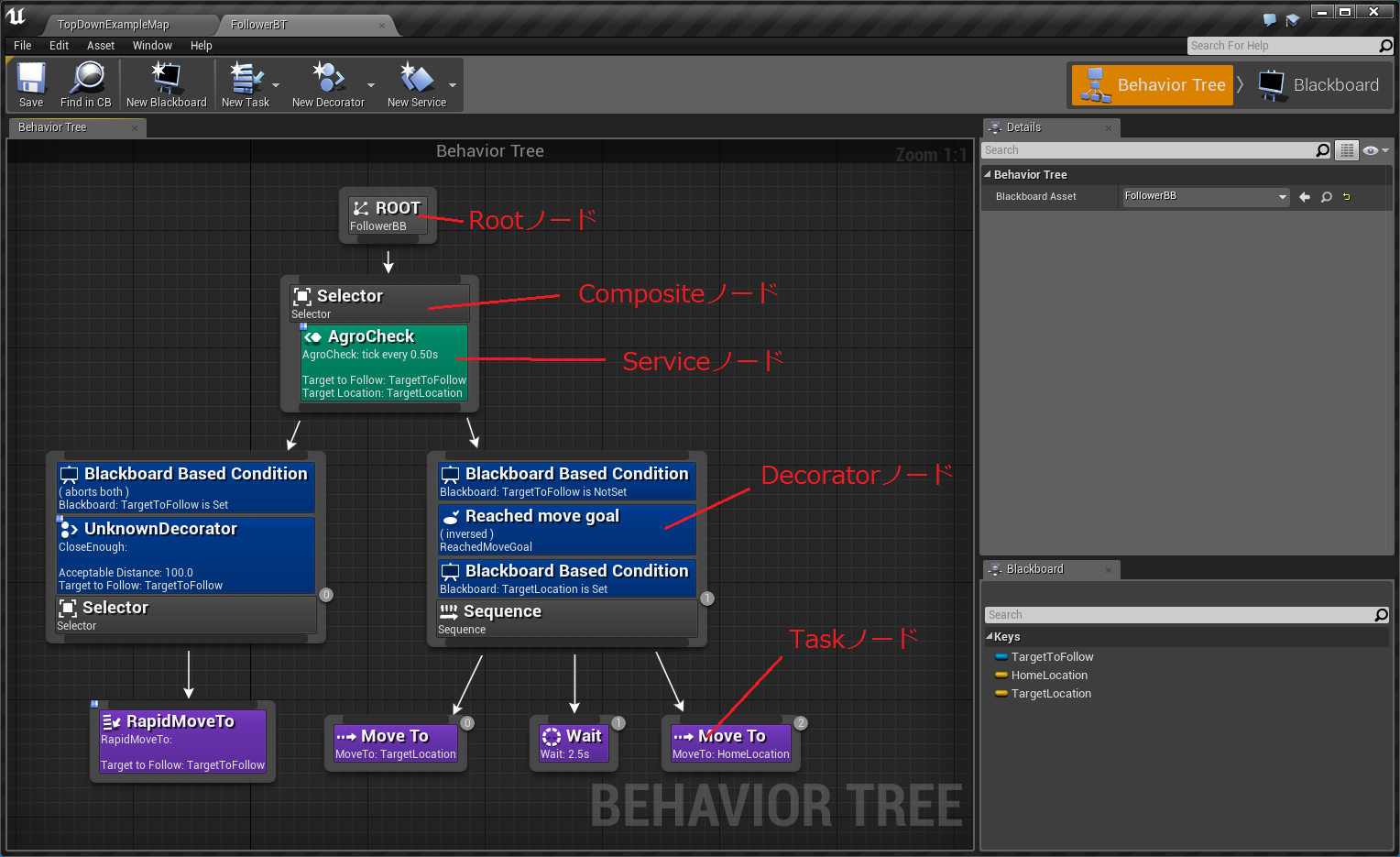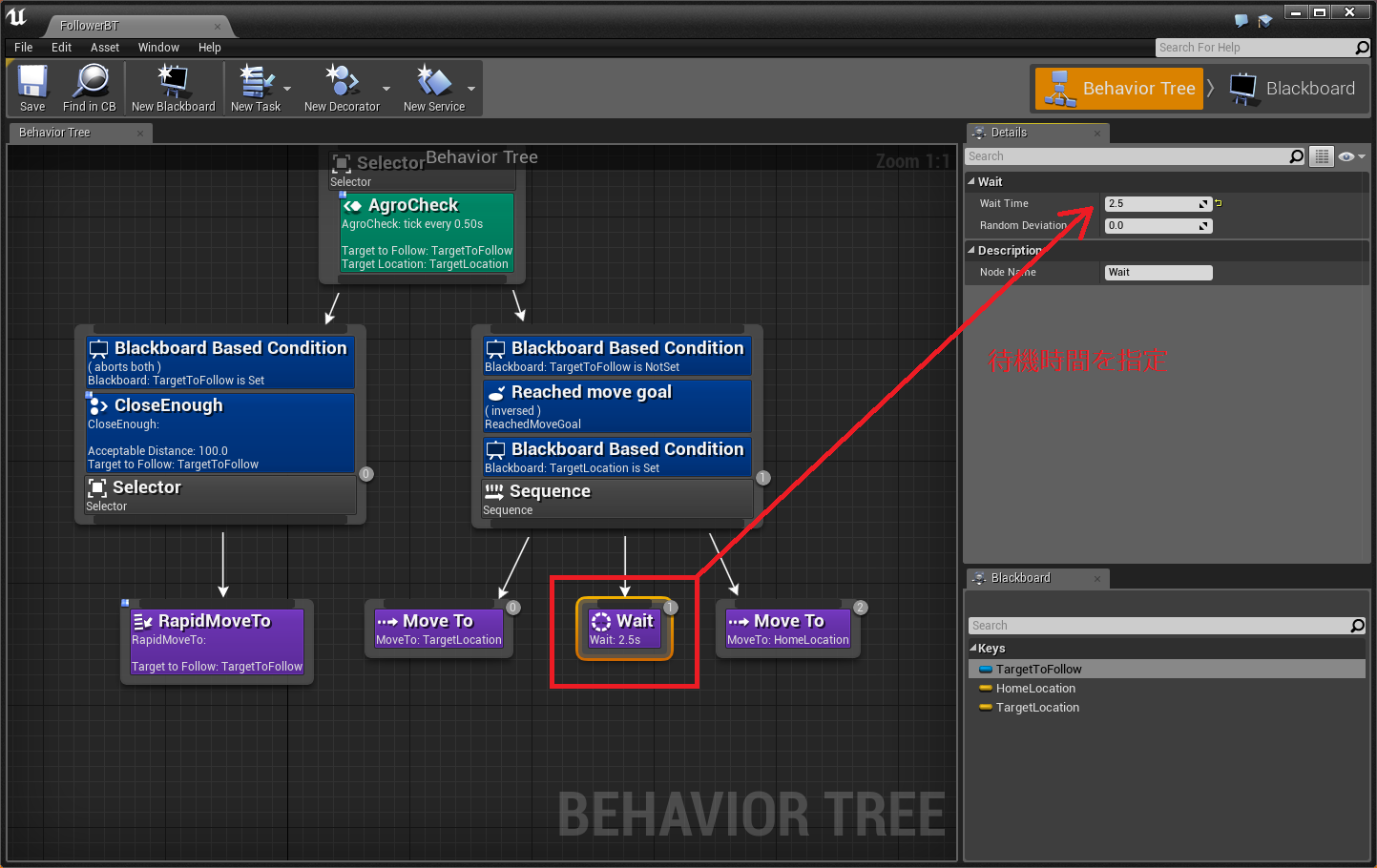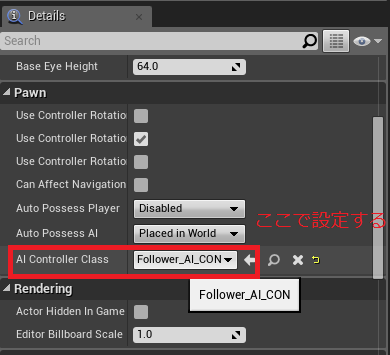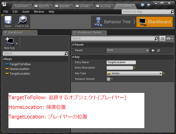 BlackBoardKey型変数の"TargetToFollow"が公開設定となっていますが、