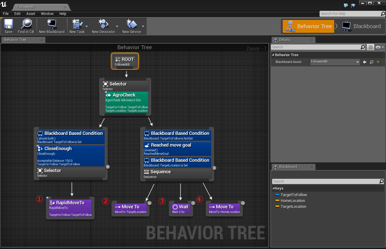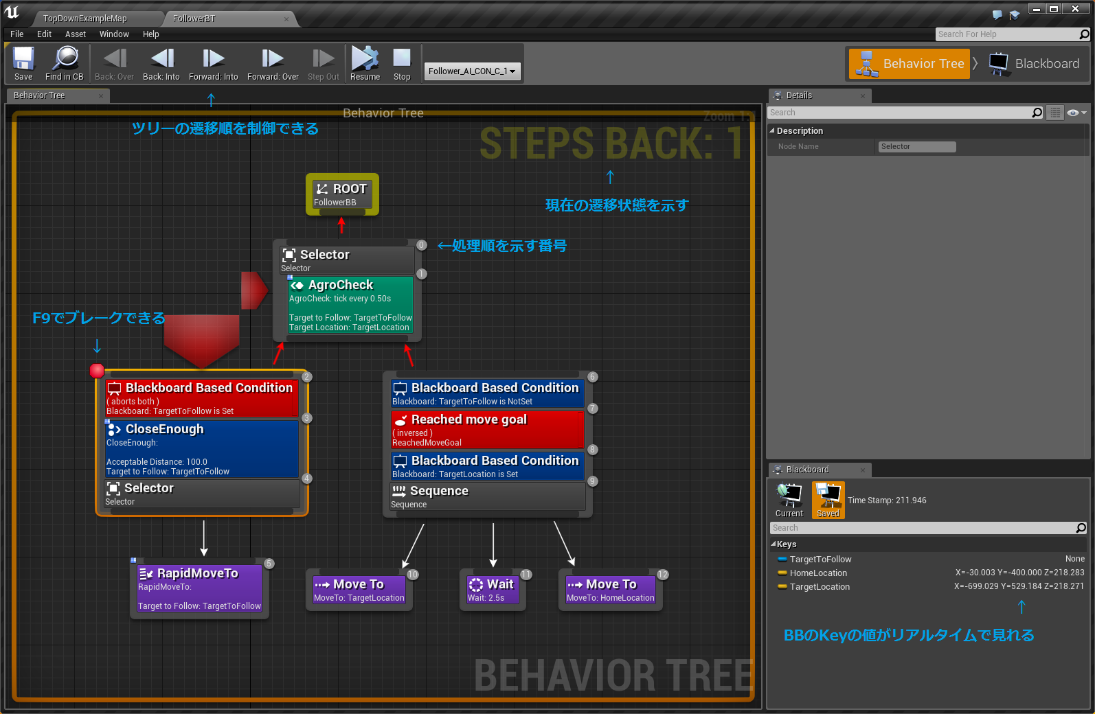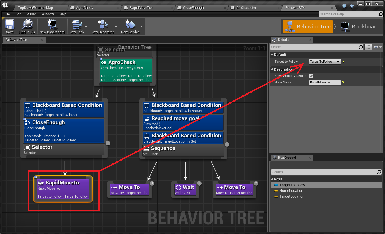 BlackBoardKey型変数の"TargetToFollow"が公開設定となっていますが、