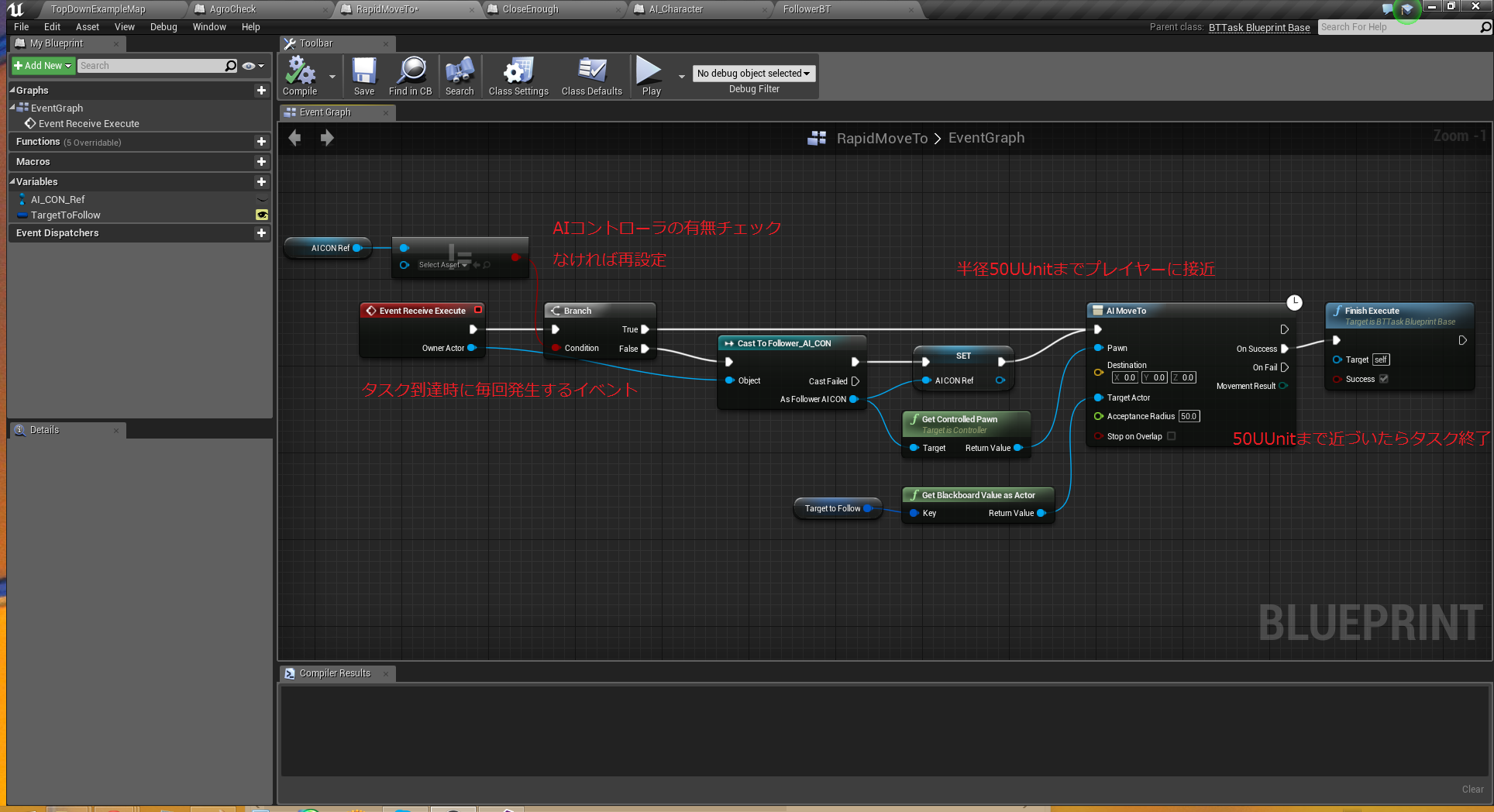 プレイヤーの半径50UUnitまで接近したらタスク終了で接近処理を止めます。
