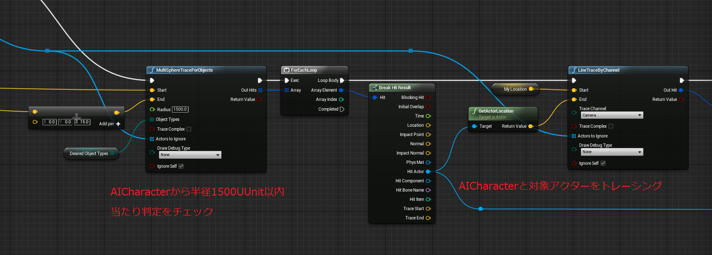 処理は、AIキャラクターの付近にプレイヤーがいるか検索になります。