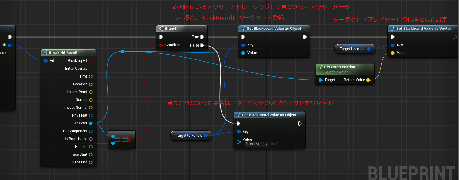 プレイヤーを発見した場合は、プレイヤーのオブジェクトと現在位置をBBに登録します。