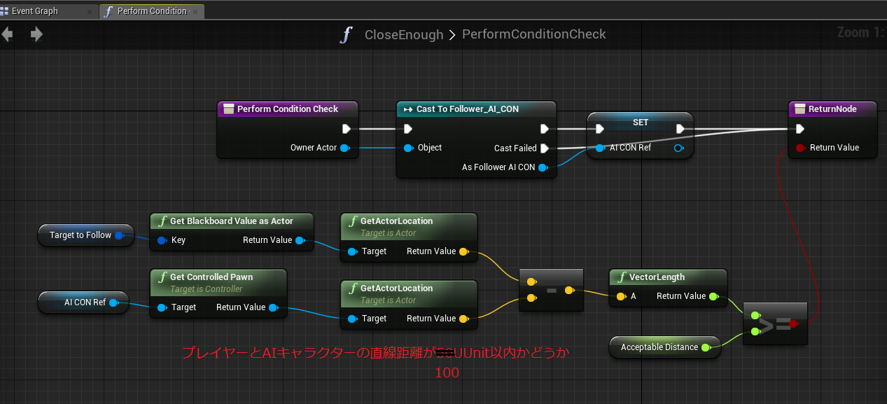 距離が100UUnit未満かどうかの結果を返す処理となります。
