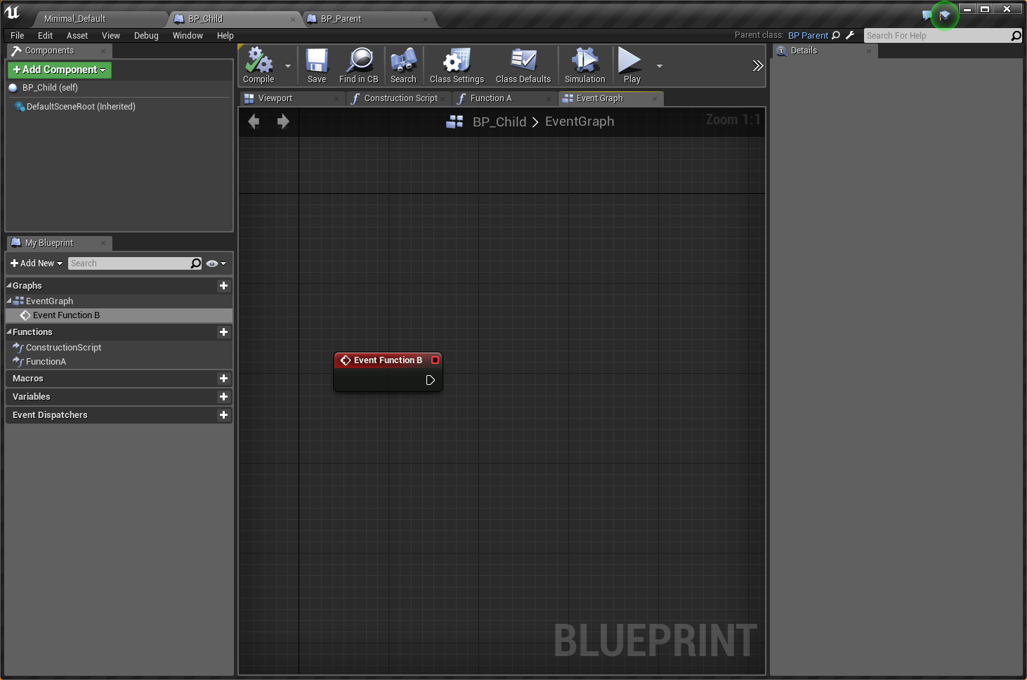 CustomEventも同様に子クラスでoverrideでき、FunctionBをoverrideする場合は「Event FunctionB」と入力することで使用することができます。